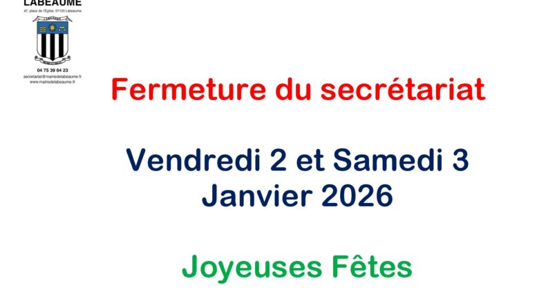 Fermeture secrétariat 2 et 3 janvier Posted on29 décembre 202529 décembre 2025 Auteur span>Secrétaire Mairie