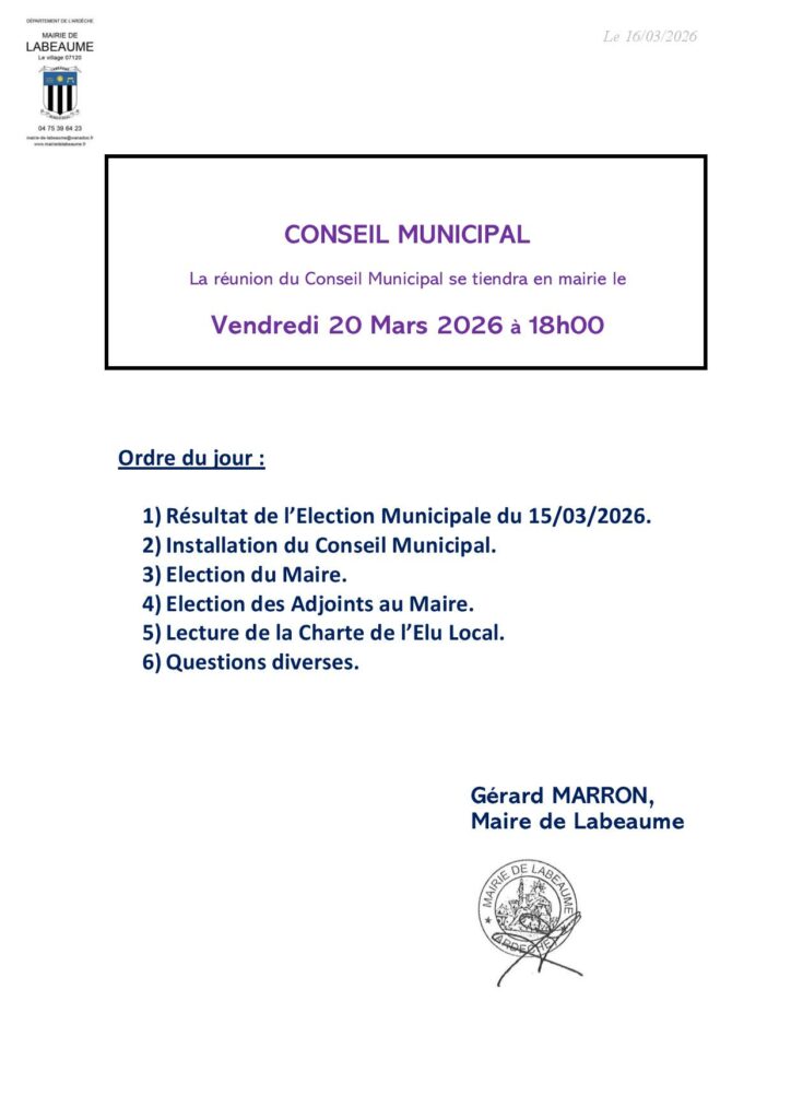 Installation du Conseil Municipal, Vendredi 20/03/2026 à 18h00 en Mairie Posted on16 mars 202616 mars 2026 Auteur span>Secrétaire Mairie