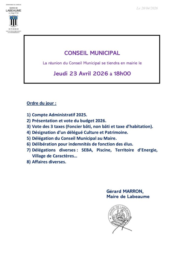 Conseil Municipal du Jeudi 23 Avril 18h00 Posted on20 avril 202620 avril 2026 Auteur span>Secrétaire Mairie